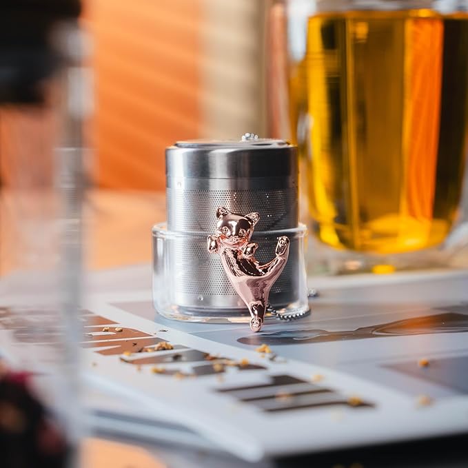 Cat Tea Infuser Stainless Steel with Secure Clip Rose Gold Kitty - Cute Animal Tea Ball Strainer, Reusable Loose Leaf Infuser w/Hanging Clip & Glass Holder Gift for Tea Lovers