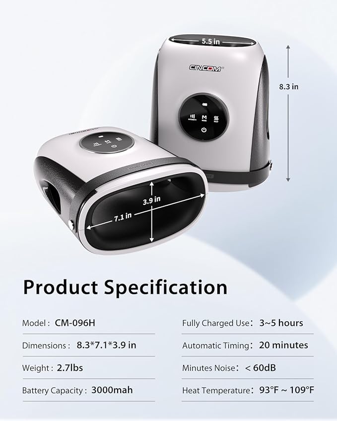 - CINCOM Hand Massager : Multiple Massage Modes to enjoy a variety of customizable settings, including kneading, air compression, and soothing heat to relieve stress and discomfort in the palms, fingers, and knuckles
