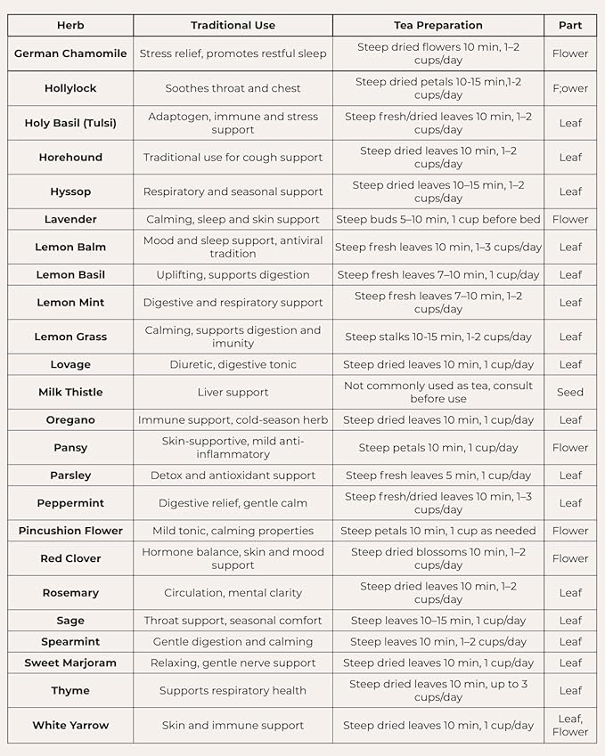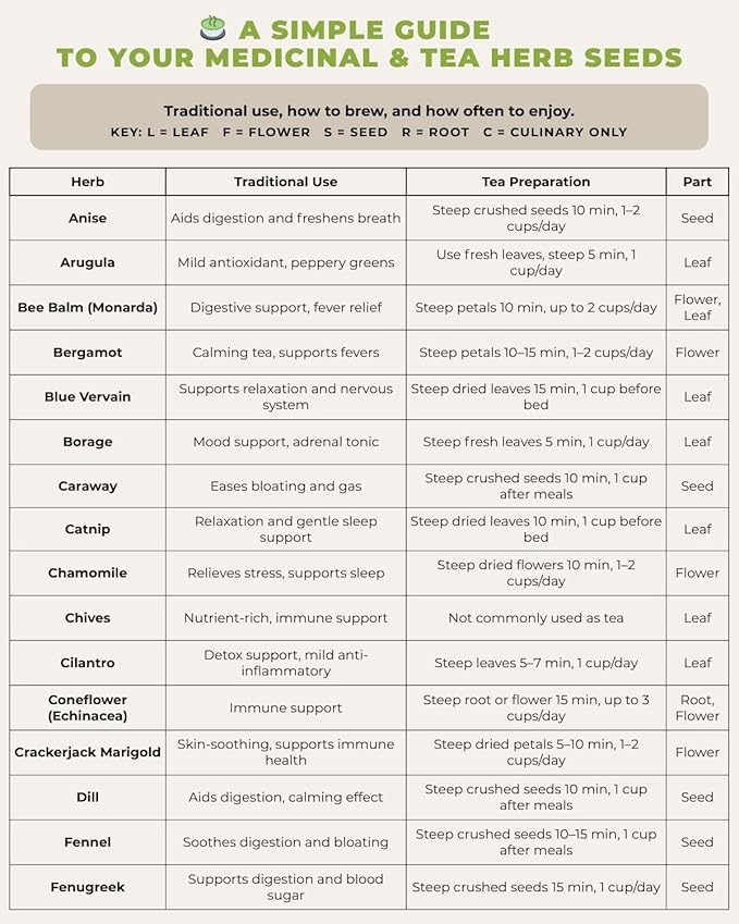 - Huge Value: Grow 40 medicinal and tea herb varieties anywhere; Includes 40 heirloom, non-GMO herb seed types; Suitable for windowsill, balcony, or backyard gardening; Ideal for calming teas, immune support, culinary flavoring, and holistic home use