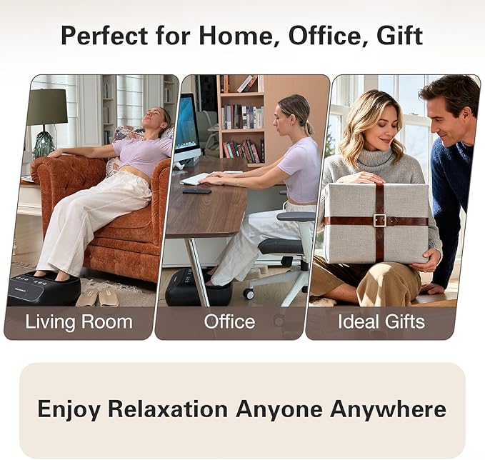 - 4-in-1 Foot Massager for Neuropathy & Plantar Fasciitis: This premium shiatsu foot massager combines deep shiatsu kneading, soothing heat, rhythmic vibration, and targeted air compression to deliver comprehensive relief. Whether you’re struggling with neuropathy discomfort, plantar fasciitis tightness, or just daily foot fatigue, its multi-functional design addresses multiple issues—boosting circulation, easing muscle tension, and calming sensitive nerves for lasting comfort
