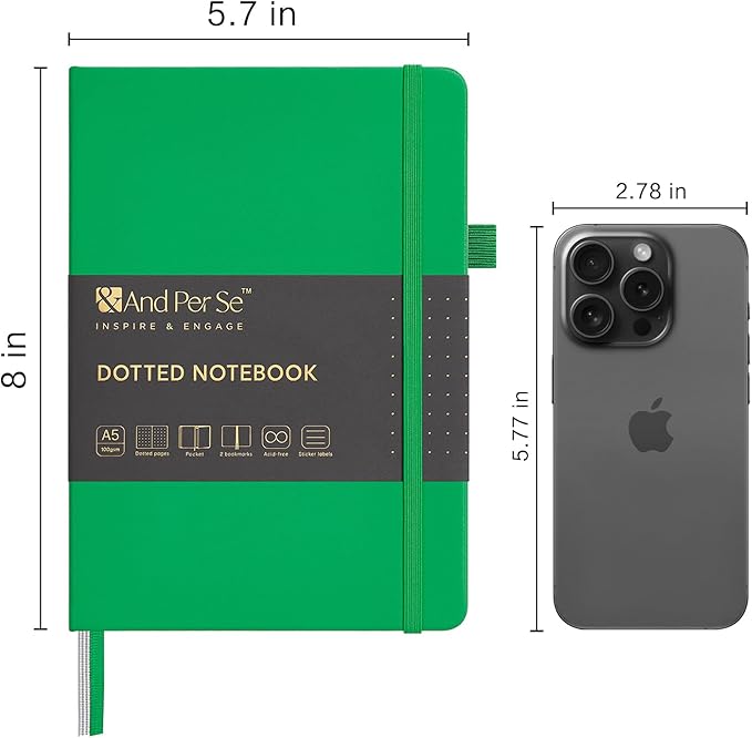 &And Per Se Dotted Journal Notebook, A5 Hardcover Leather Bullet Dotted Journal, 160 Pages 100 gsm Thick Paper, 3 Sheets of Stickers Included - 5.7'' x 8''(Emerald)
