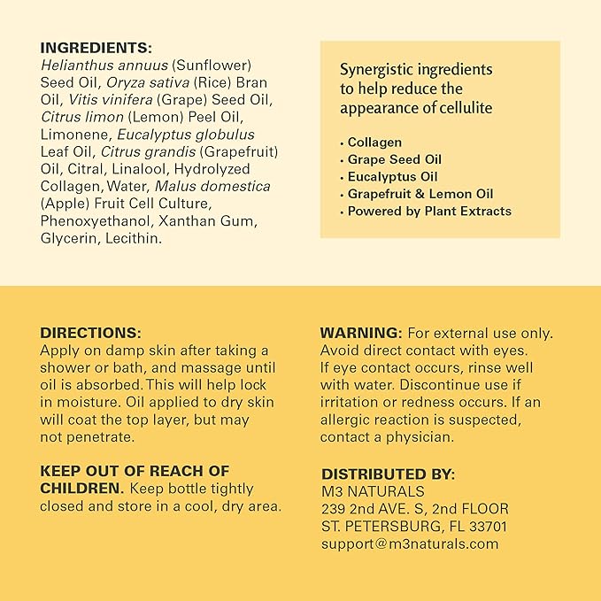 - Revitalizing Lightweight Formula: M3 Anti Cellulite massage oil gives your skin deep hydration without the heavy & sticky feeling from typical body oils.