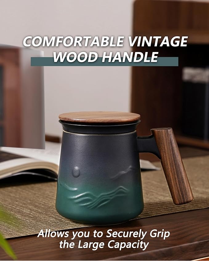- COMFORTABLE WOOD HANDLE AND LID: The artistic bits of this tea mug would have to be the specially wood handle, the ergonomically-designed angle and Thumb holder that allows you to comfortably and securely grip. The wooden lid keeps the tea warmer and the aroma long-lasting. it's also doubles as a coaster to catch drip tea after finished steeping. the wooden features create a cosy aesthetic and adds a vintage touch to your coffee and end table.