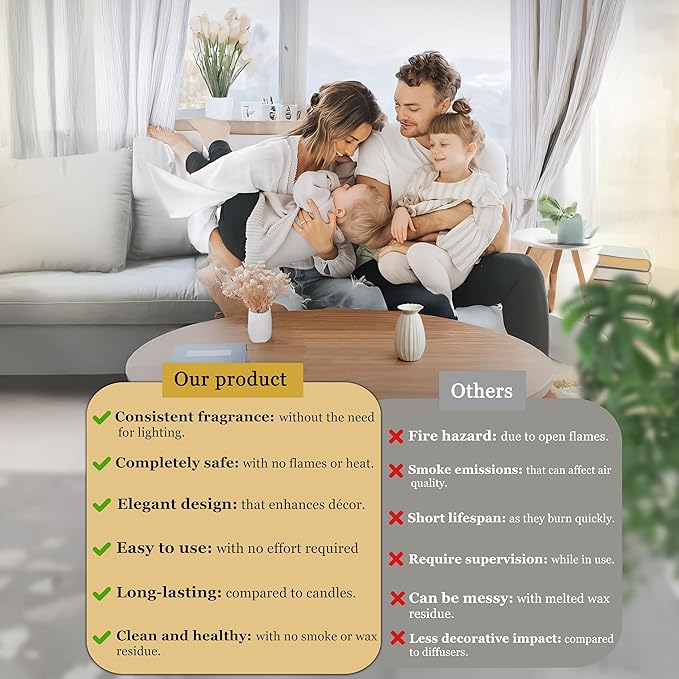 - π₯π ππππππππ, πππππππππππ-π πππ, & πππ π ππ πππ ππππππππ: Unlike candles and plug-in air fresheners, this flameless diffuser requires no heat, batteries, or electricity, making it an ideal choice for homes with children, pets, or workplaces where open flames are not allowed. Enjoy a safe and hassle-free fragrance experience anywhere!