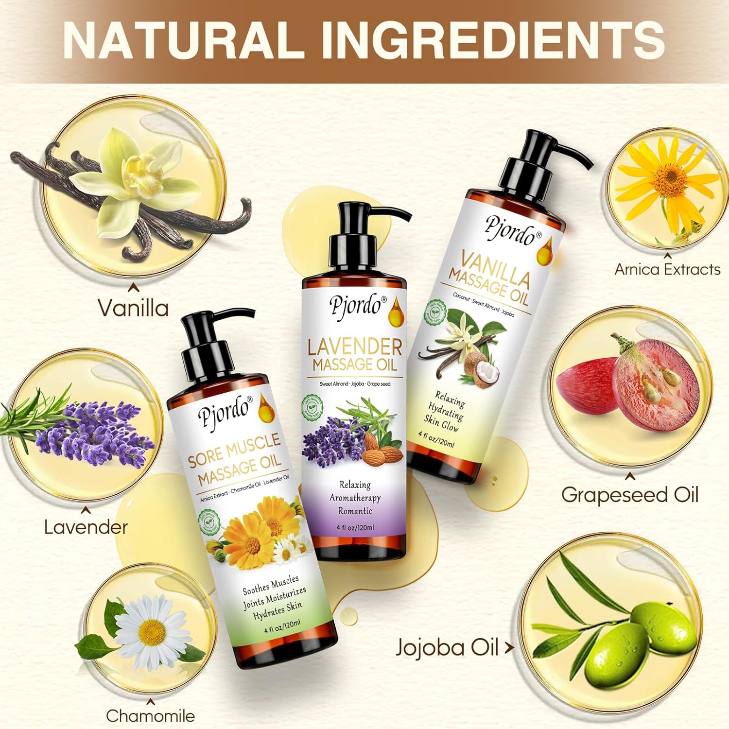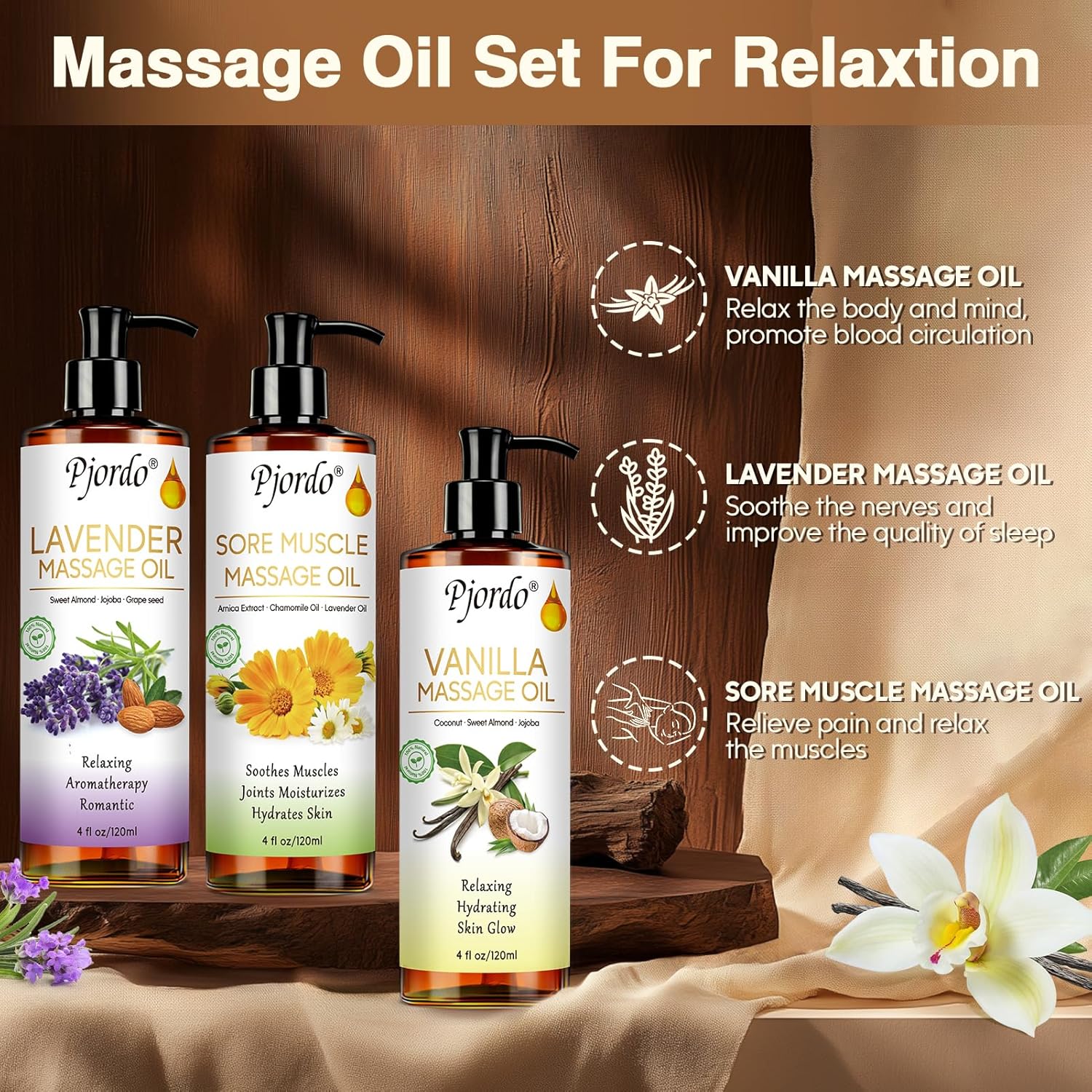 - Vanilla Massage Oil: Pjordo soothing massage oil for massage therapy contains vanilla planifolia fruit oil and jojoba oil. It can not only deeply nourish the skin, improve the skin texture, and regulate the skin's oil secretion, but also soothe the body and mind, and bring you a relaxing and comfortable massage experience.