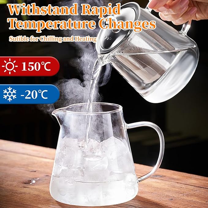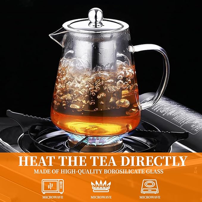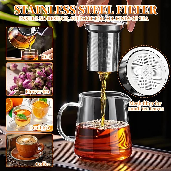 - VERSATILE BREWING: This tea kettle has a removable infuser, which made with food grade 304 stainless steel, there is an ultra-fine filter that can filter most teas. You can use this glass tea pot to brew loose leaf tea, tea bags, blooming camellia, fruit tea, herbal tea