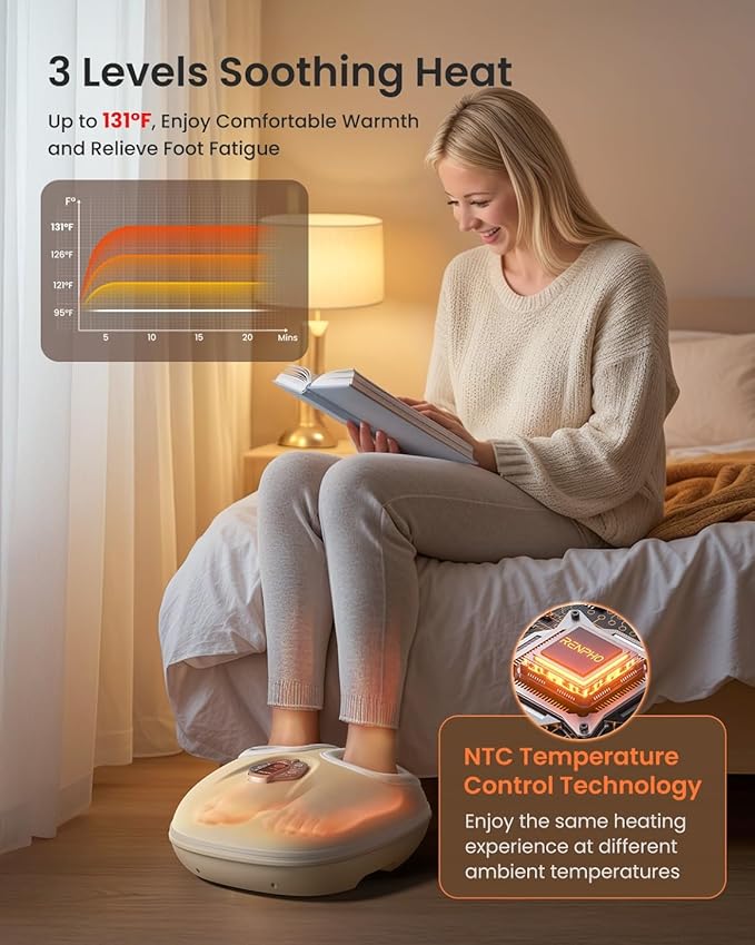 - 3 Levels of Soothing Heat & NTC Tech: This shiatsu foot massager quickly heats up to 131°F. Exclusive NTC Temperature Control Technology ensures consistent heating performance across different ambient temperatures. Experience quick muscle tension relief and relaxation with a heated foot massager designed to improve circulation and relieve fatigue. Improve sleep quality by using RENPHO plantar fasciitis massager before bed
