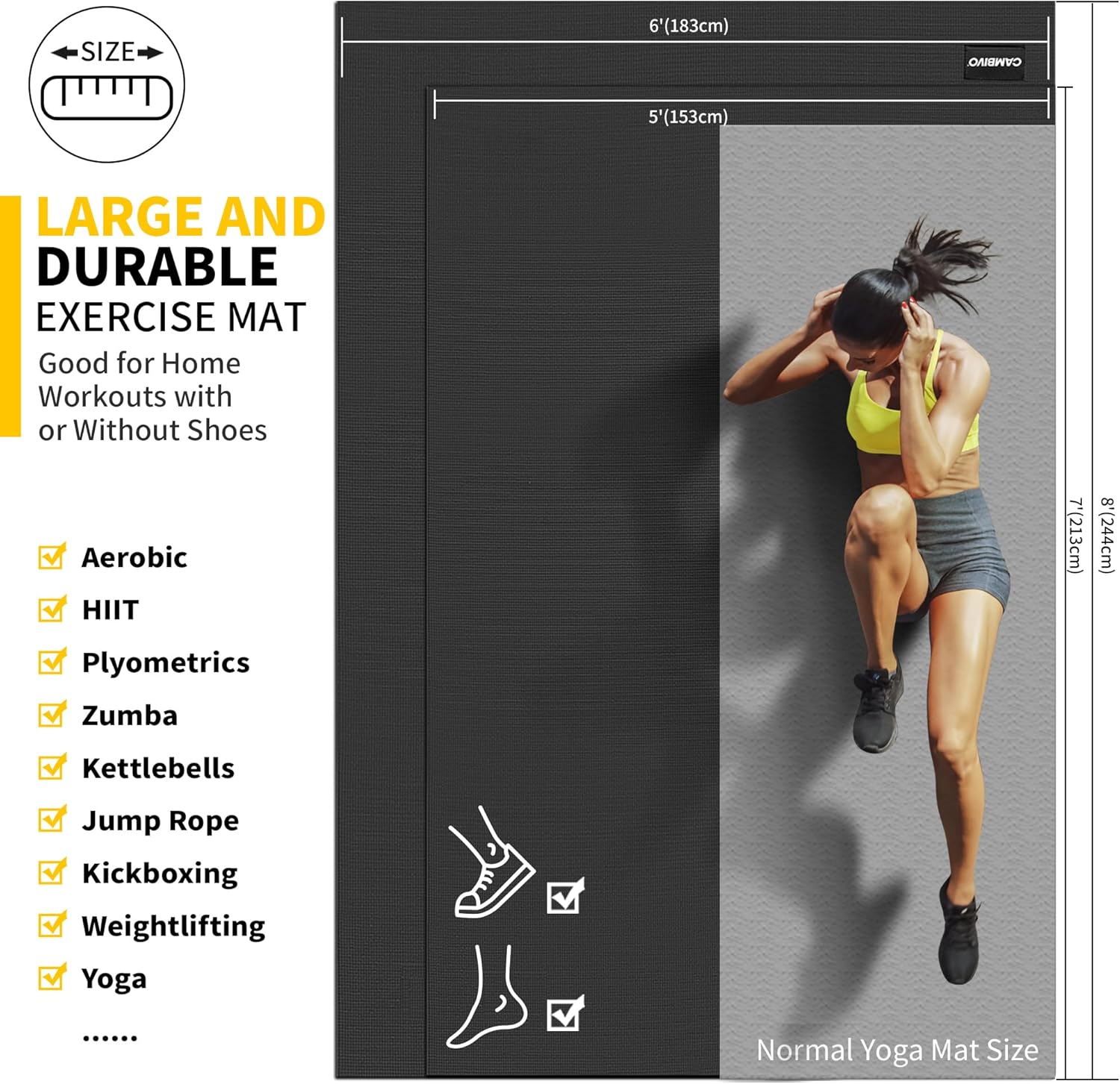 CAMBIVO Large Exercise Mat for Home Workout, 8'x6'/7'x5'/6'x4' (7 mm) Extra Thick Exercise Mat for Home Gym, Shoe-Friendly, Non-Slip Gym Mat for Jump Rope, Weights, Cardio, Fitness