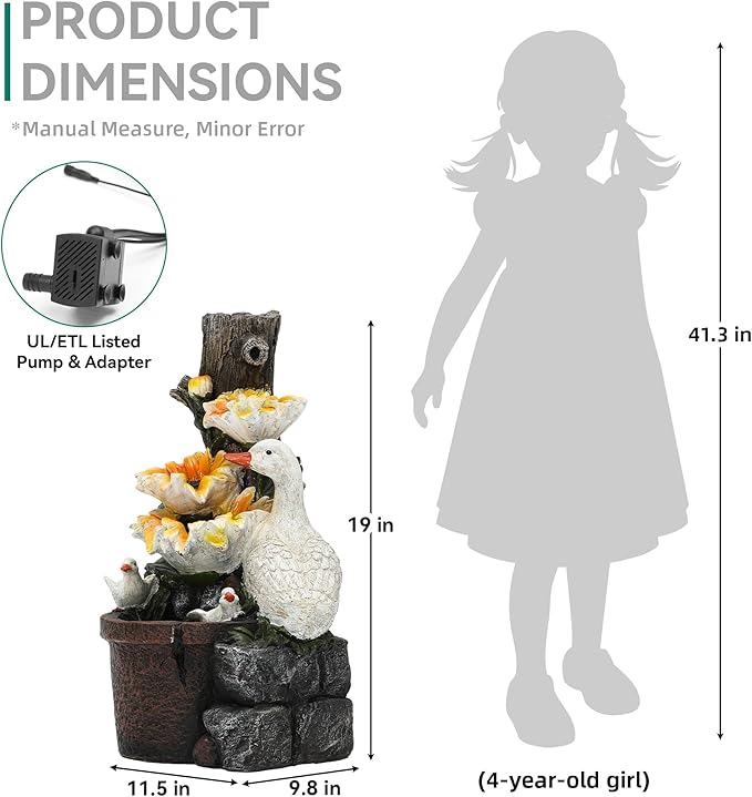 - WHUMSUCAL SCULPTURAL DESIGN: This outdoor water fountain features playful ducks frolicking around a pot of blooming sunflowers. With handcrafted embossed textures and antique details, it brings natural charm and fun to any garden or home. Measuring 11.5"L X 9.84"W X 19.09"H, it's the eye-catching focal point for any garden, patio, or outdoor living space.