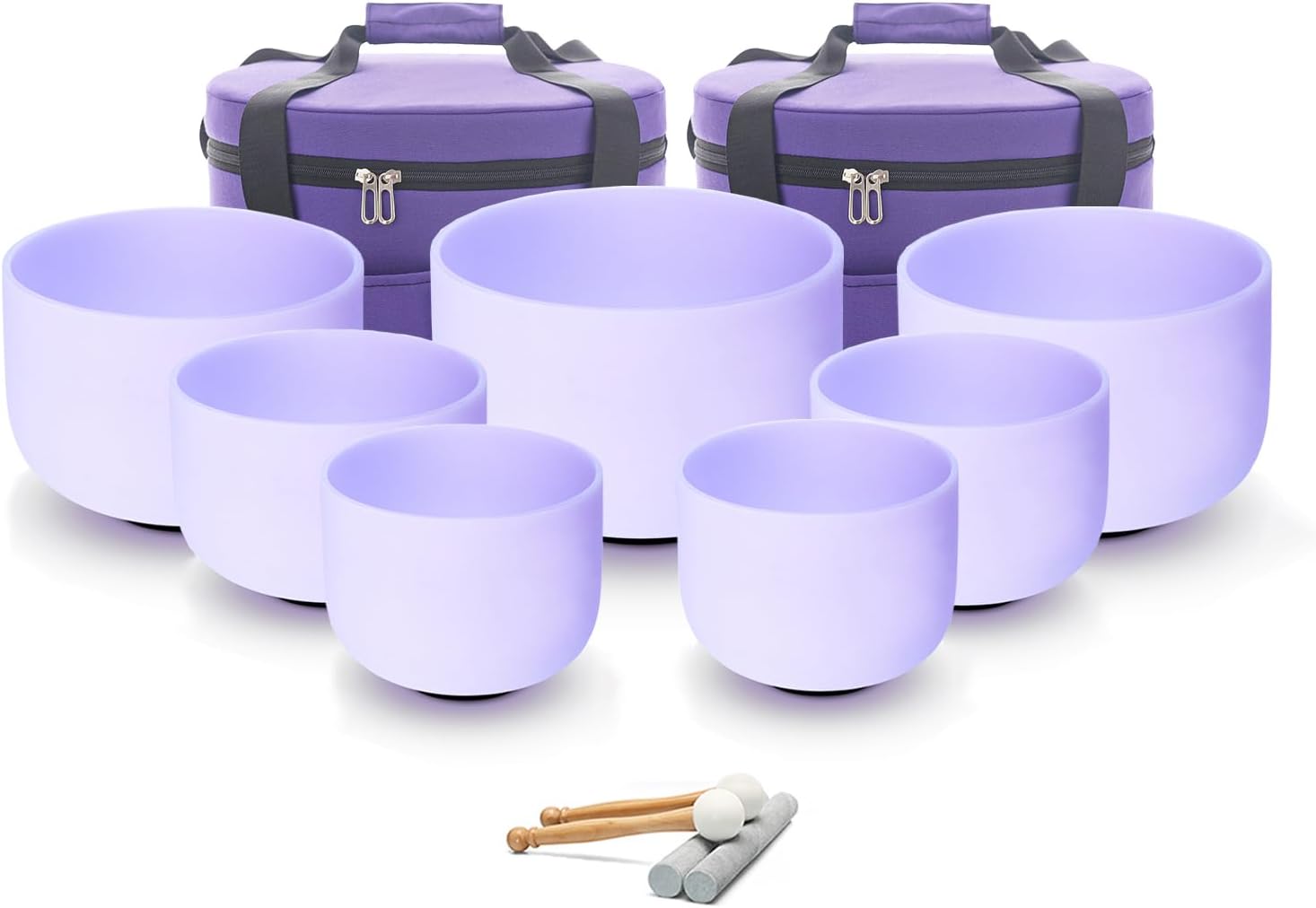 - Hye-eun Purple Singing Bowl Set includes: 7 pcs bowls from 7inch to 12inch, Including 12"C 11"D 10"E 9"F 8"A 7"G 7"B. The crystal singing bowl set comes with two heavy duty carrying cases and each singing bowl is housed in padded tank inside the carrying cases. 2pcs suede strikers and 2pcs rubber mallet ,7pcs O-rings ,and 5pcs insert protection are packed in bundle pockets.