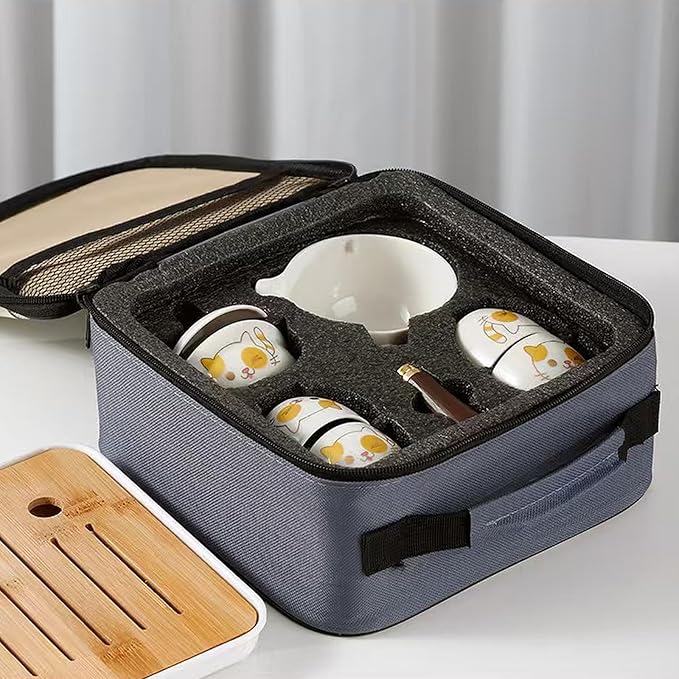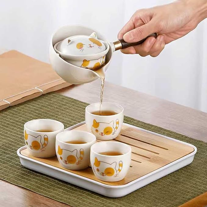Ceramic Portable Travel Tea Set, Chinese Kungfu Tea Set with 360 Rotation Teapot and Infuser, 4 Tea Cups, Tea Tray And Travel Bag (Cute Cat)