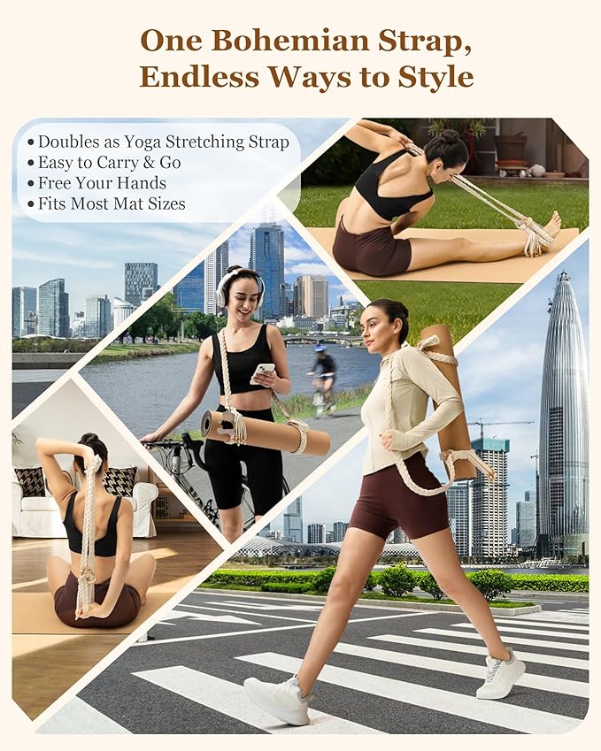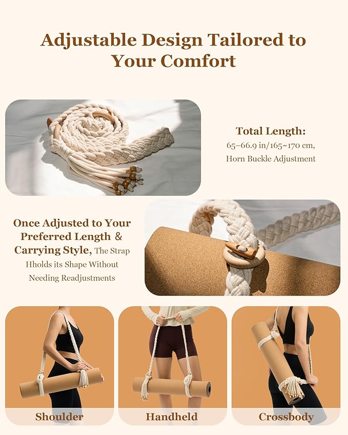 - 【ADJUSTABLE SIZE FOR UNIVERSAL FIT】Featuring sliding beechwood rings and reinforced horn buckles, this strap is easily adjustable to accommodate a wide range of yoga mat sizes and carrying preferences. Whether you're using a slim travel mat or an extra-thick Pilates mat, the customizable length ensures a snug, secure fit. Carry it over the shoulder, across the body, or by hand—this versatile design adapts effortlessly to your comfort and style.