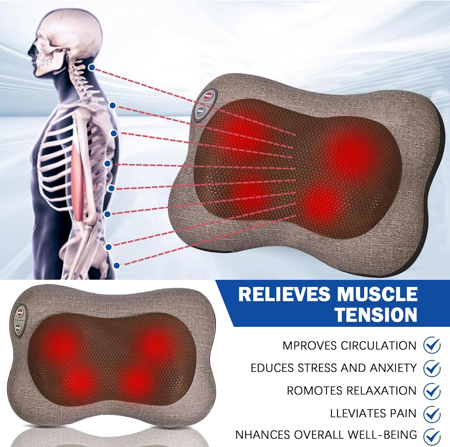 - Smart Heat and Auto-Off Massage: Customize your relief with 3 speed settings and reversible massage directions. Massager for back pain built-in heating system delivers soothing warmth that boosts circulation, melts away muscle tension, and provides deeper pain relief. Neck massager 15-minute auto-shutoff lets you fully unwind without concerns ,perfect for post work relaxation or midday stress relief