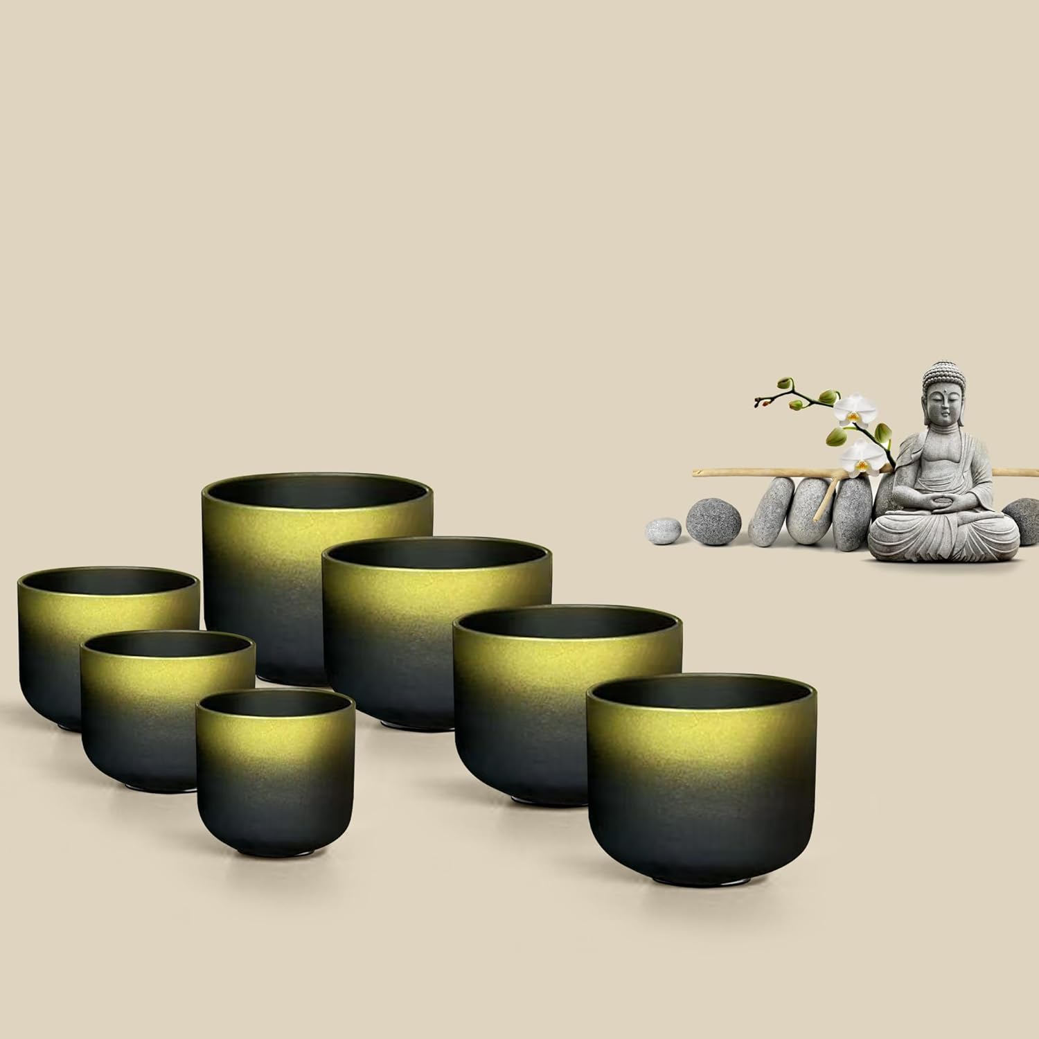 Ryan Dvan Crystal Singing Bowl Set 7-12 Inch, Black with Gold Frosted Quartz Sound Therapy Bowls with Mallets, O-Rings & 2 Carrying Cases — Chakra Healing, Reiki, Yoga, Meditation, Energy Balancing