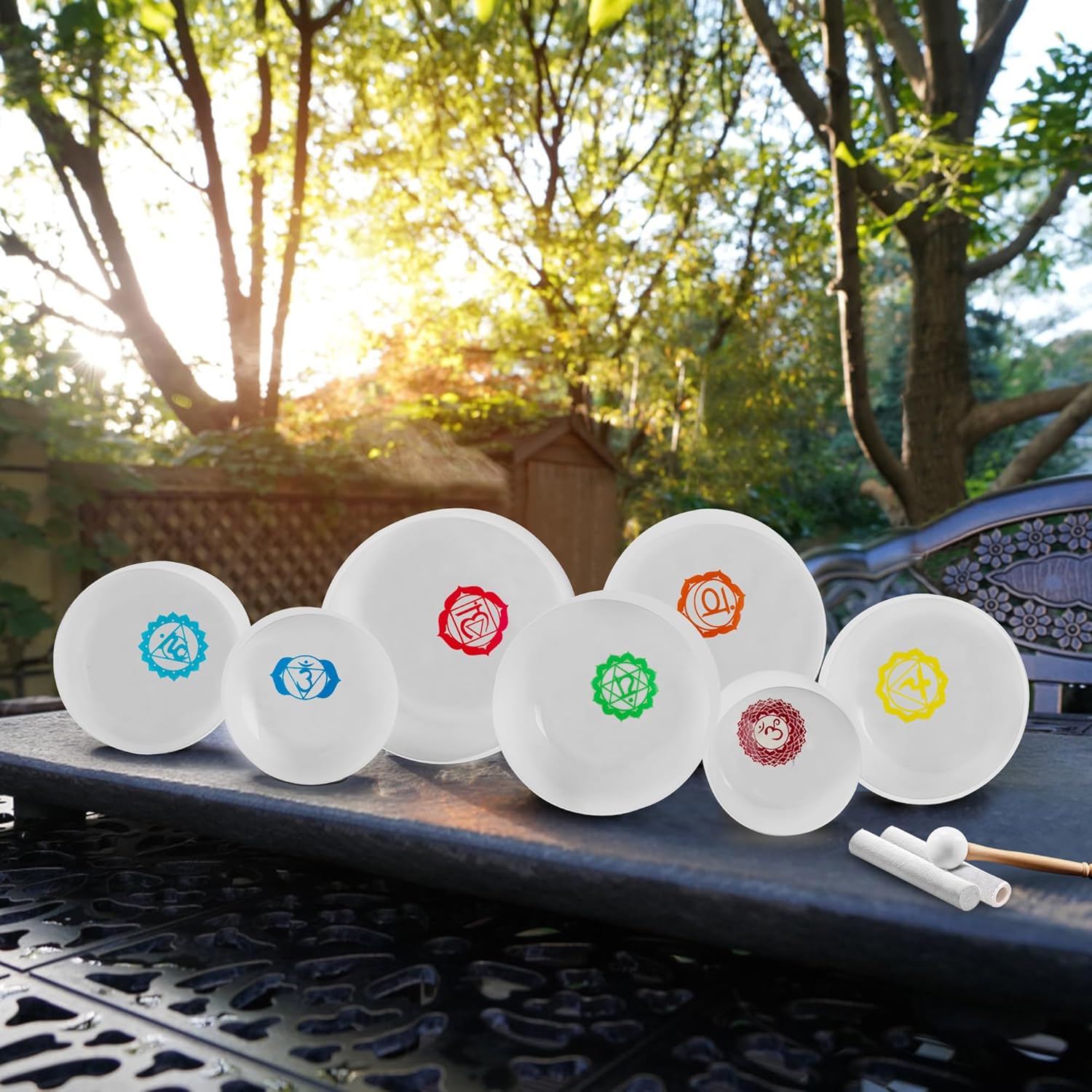 - Complete 7-Chakra Portable Set-This 7-piece 432Hz crystal singing bowl set (7-12 inch) includes precision-tuned sizes: 7" B Crown, 8" A Third Eye, 8" G Throat, 9" F Heart, 10" E Solar Plexus, 11" D Sacral, 12" C Root. Comes with a rubber mallet, two suede strikers, seven O-rings, and two lightweight cases for home meditation, energy sessions, or travel.