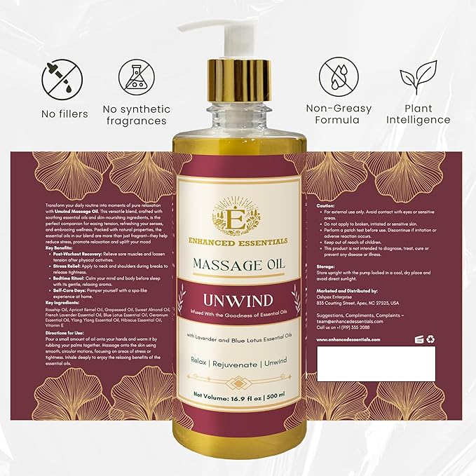 - Why Use Unwind Massage Oil? Deep Relaxation Ritual Designed to calm the mind and body after a long day—ideal for evening wind-downs. Nourishes Without the Grease Lightweight yet silky formula absorbs quickly, leaving skin soft and non-sticky. Natural Aromatherapy Escape Scented only with pure essential oils for a spa-like, mood-lifting experience—no artificial fragrance.