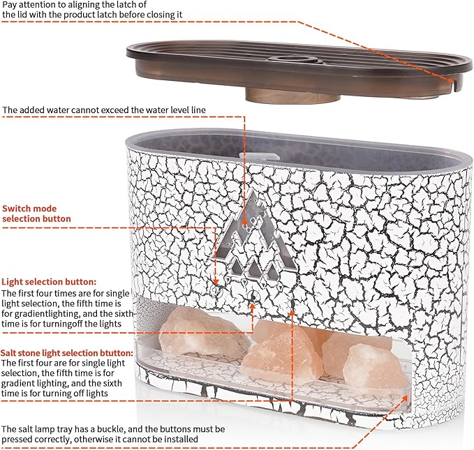 - 【Attention】 The addition of water to the water tank should not exceed the maximum water level line. It is normal for the Himalayan salt stone base to be tightly closed to prevent the Himalayan salt stone from slipping. It is necessary to use force from the back to retract the base