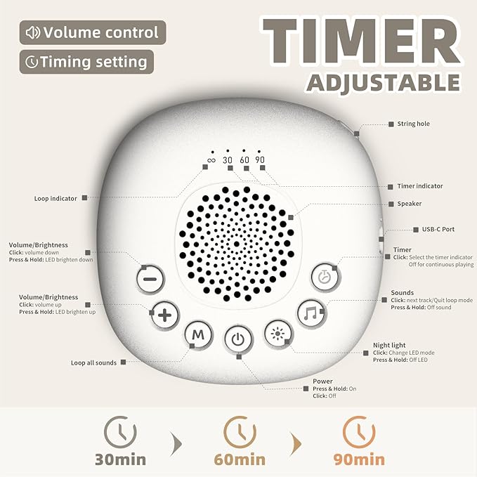 - Baby Sleep Companion & Gift: This portable noise machine features customizable timers of 30, 60, or 90 minutes or continuous play, adjustable volume and LED intensity to create a perfect sleep environment for baby instant, anywhere serenity.