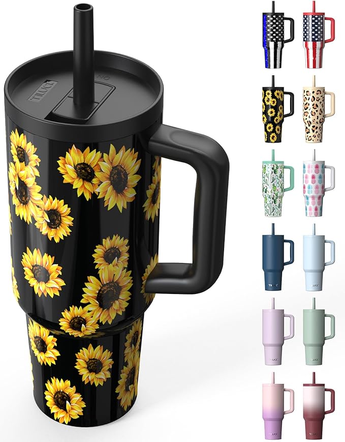 TILUCK 40 oz Tumbler with Handle, Vacuum Insulated Stainless Steel Travel Mug with 100% Leak-Proof Silicone Straw Lid, Cupholder Friendly Water Bottle(SunFlower, 40oz)
