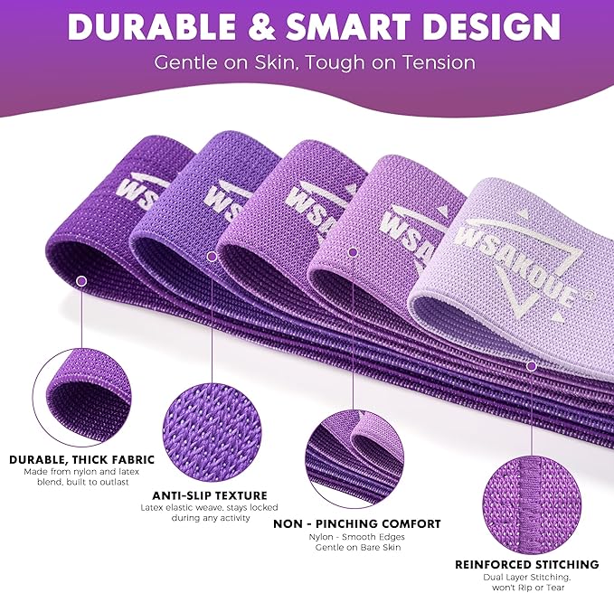 WSAKOUE Fabric Resistance Bands for Working Out – 5 Booty Bands for Women & Men, Exercise Workout Bands for Legs, HIPS & Glutes – Ideal for Home Fitness, Yoga, Pilates & Rehab