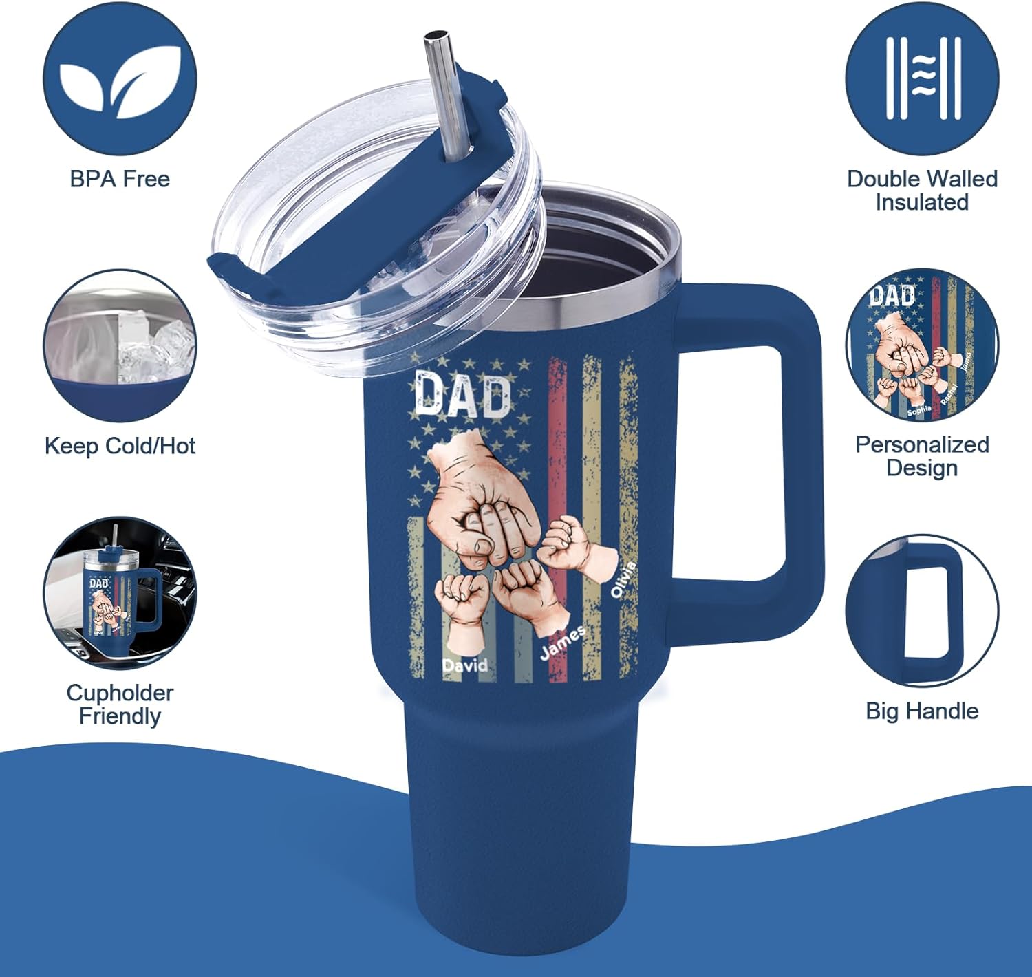 Custom Dad Tumbler with Kids Names, Personalized 40 Oz Tumbler with Handle and Straw, Personalized Birthday Gifts for Dad Husband