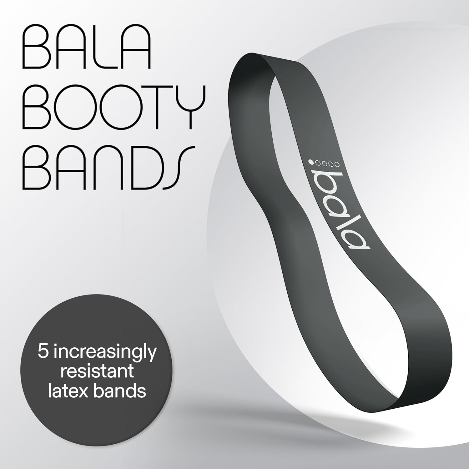 - Bala Booty Bands in Charcoal: The ultimate werk-out accessory, Booty Bands are designed for versatility. Includes 5 increasingly resistant latex bands and a nifty carrying case.