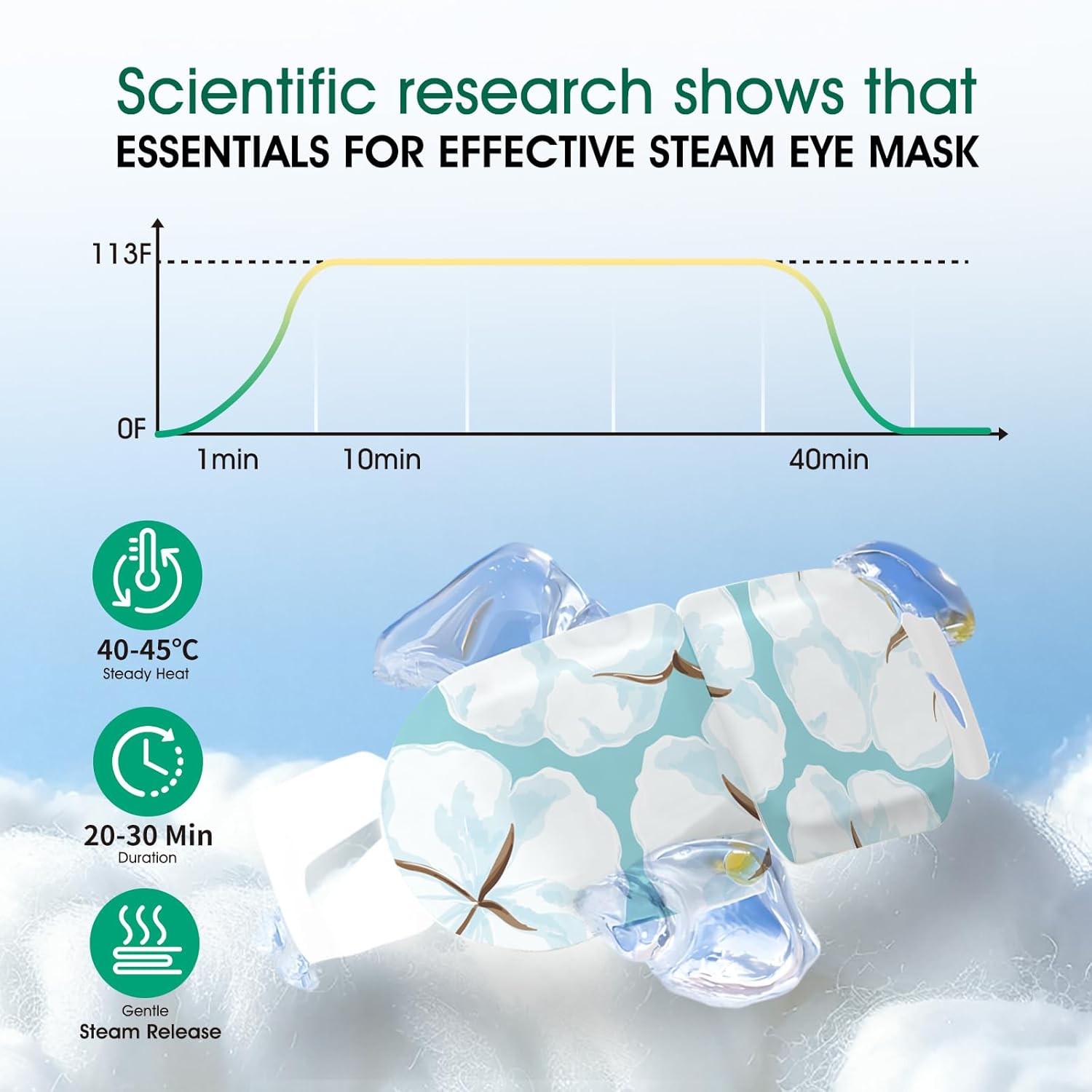- 【Professional Heated Eye Mask Disposable】Delivers optimal 104°F-110°F moist heat to steam moisturize eyes, lasting about 20-30 minutes. Effectively soothes eye fatigue, dryness and puffiness while boosting circulation. Perfect spa-like treatment for quick relief at home, office or while traveling.