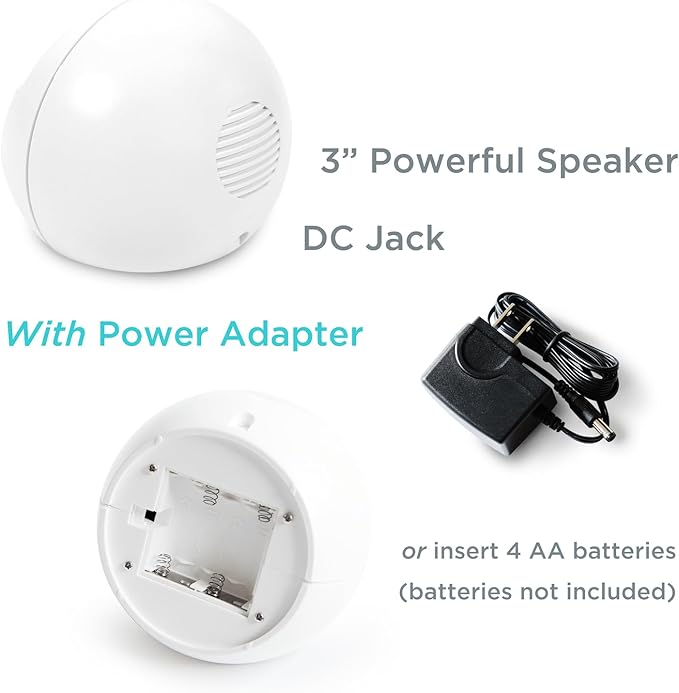 - [Light Weight, Compact size, a 3-inch Powerful Speaker, Easy to Use] a 3-inch 3W speaker boost steady sound, creates a surround sound atmosphere. It perfectly blends in the background without notice. Plug-in outlet by included adapter or uses 4 AA batteries (not included), flexible accompany with you everywhere. 0.84 lbs, Dia. 5.5 x 4.6 inches. It is ideal for home, travel, the office, the car, yoga, leisure , lazy time and a flexible work environment