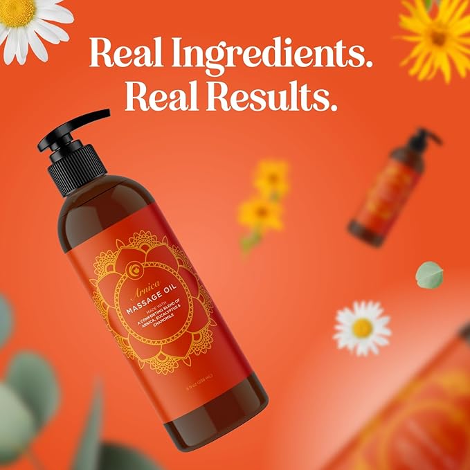 - Sore Muscle Massage Oil for Massage Therapy - Our arnica oil formula for professional or home use applies smoothly to skin to assist joint and muscle massages to help ease the mind and body