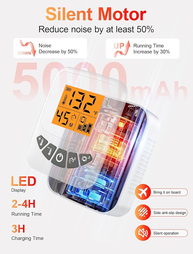 - Special Feature : 104℉ - 140℉ Temperature Adjustable, 2A Cable & Storage Bag, 5000mAh Battery & Low Noise Motor, Cordless & Rechargeable & Portable, Detachable Controller & LED Display 104℉ - 140℉ Temperature Adjustable, 2A Cable & Storage Bag, 5000mAh Battery & Low Noise Motor, Cordless & Rechargeable & Portable, Detachable Control… See more