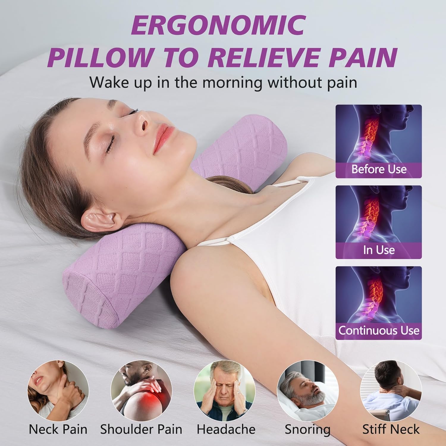 - 【 Ergonomic Cylinder Pillow 】 Our round cervical pillow for neck pain is ergonomically designed to help provide a therapeutic sleep posture to relieve or prevent head, back, neck, and shoulder pain caused from uncomfortable sleep and poor spinal alignment. . Perfect curvature helps the vertebrae stay relaxed, keeps neck and shoulders aligned, and maintains the natural curvature of the spine, so the neck traction pillow can be used as a posture pillow to adjust cervical curvature.
