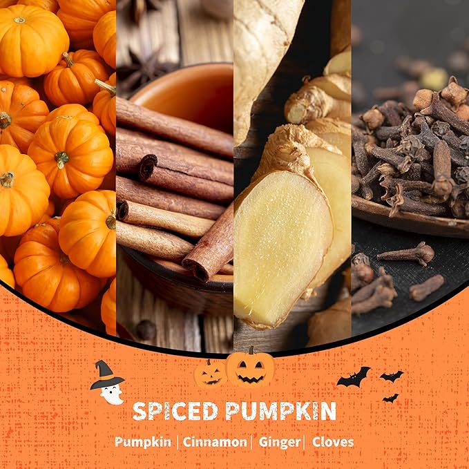 - Scent:Spiced Pumpkin scent is a warm, inviting blend of creamy pumpkin puree, ground cinnamon, nutmeg, and a touch of clove, wrapped in a cozy blanket of vanilla and amber, evoking the comforting essence of autumn harvest and holiday spice.