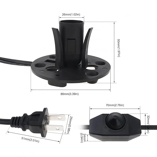 - Specifications - 6 feet long cord with dimmer switch and base assembly, 110v input. Comes with two free 15w bulbs. Standard e12 socket. Butterfly clip compatible with betus salt lamps and other brands.