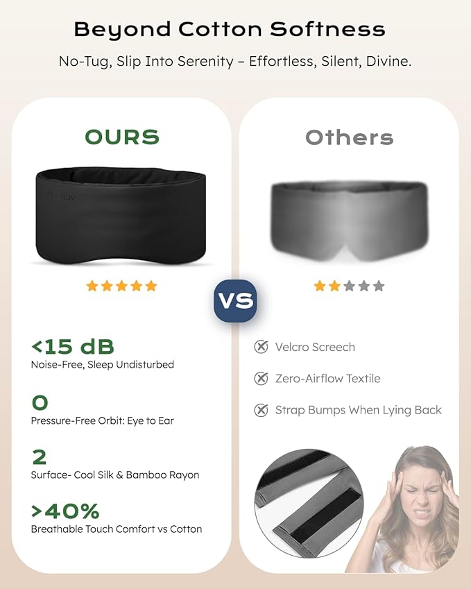 - Adjust in Silence, Dream Without Disturbance! Engineered with Tear-Free Silent-Adjust Straps โ no velcro rips, no buckle clicks! Glide the straps seamlessly for a custom fit (fits all head sizes 20-28in). Perfect for light sleepers, co-sleeping couples, or frequent flyers. Finally, zero noise adjustments in pitch darkness