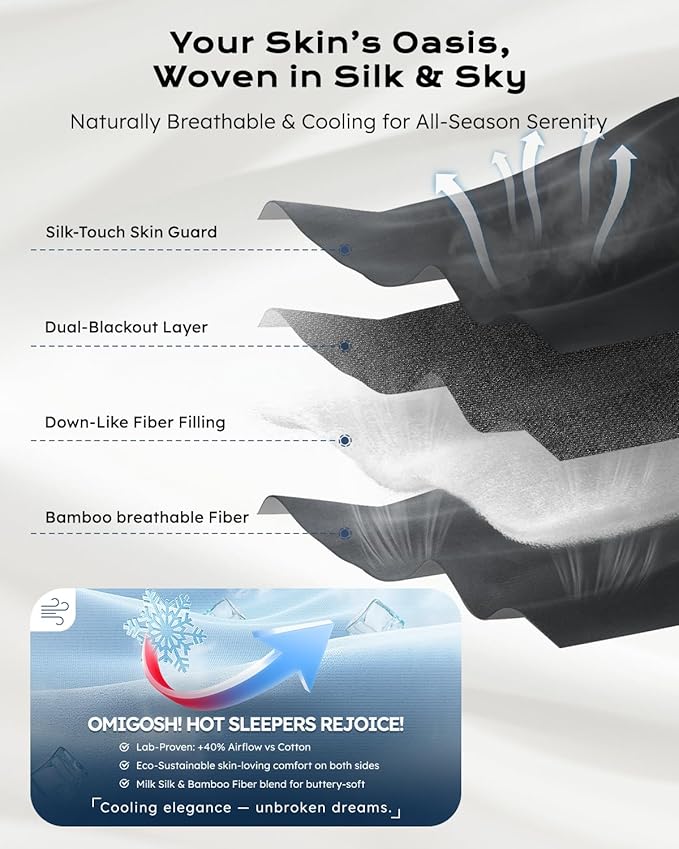 - Dual-Sided Luxury, Single-Minded Serenity! Experience the Cloud Like Dual-Fabric Magic โ one side features skin-cooling Milk Silk for hot nights, the other offers breathable Bamboo Fiber for year-round comfort. Reversible design adapts to your mood: sleek satin for evening elegance, matte finish for daytime chic. No more compromising between style and function