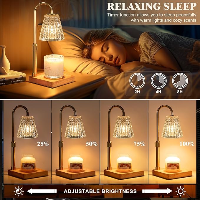 - 【4 Brightness & 8H Timing Function】The candle warmers comes with 4 different levels of brightness to meet different needs. The brighter the light, the faster the candle melts. And our electric candle warmer lamp can be turned off by timing function 2H/4H/8H.While enjoying the fragrance, you no longer have to worry about forgetting to blow out the candle at night, so that you can enjoy uninterrupted sweet dreams!