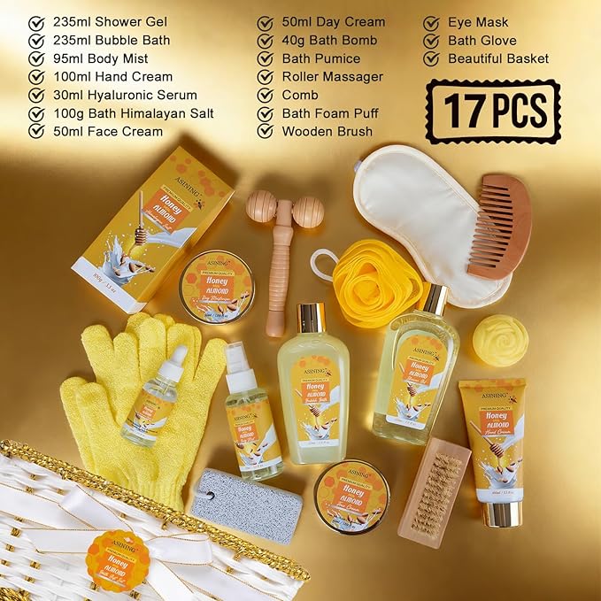 Gifts for Women Gift Basket for Women - 17 Pc Honey Almond Scented Home Bath Pampering Package Spa Bath & Body Gift Set, Luxury Home Spa Bath Gift Basket, Pamper Gifts for Woman & Teens