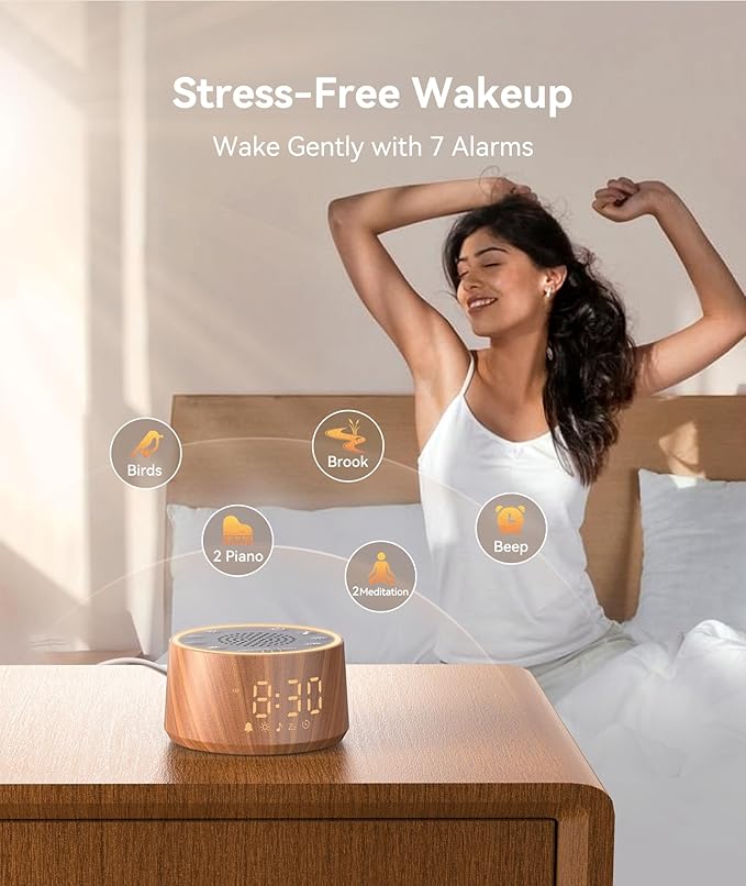 - [Wake Up Refreshed] Say goodbye to noisy, stressful mornings! Our sound machine alarm clock offers 7 soothing nature alarms (birdsong, piano + 5 more) sync with your natural rhythm—working with your brain, not against it. 9-minute snooze ensures gradual ascent into your mornings. Start renewed, not rattled