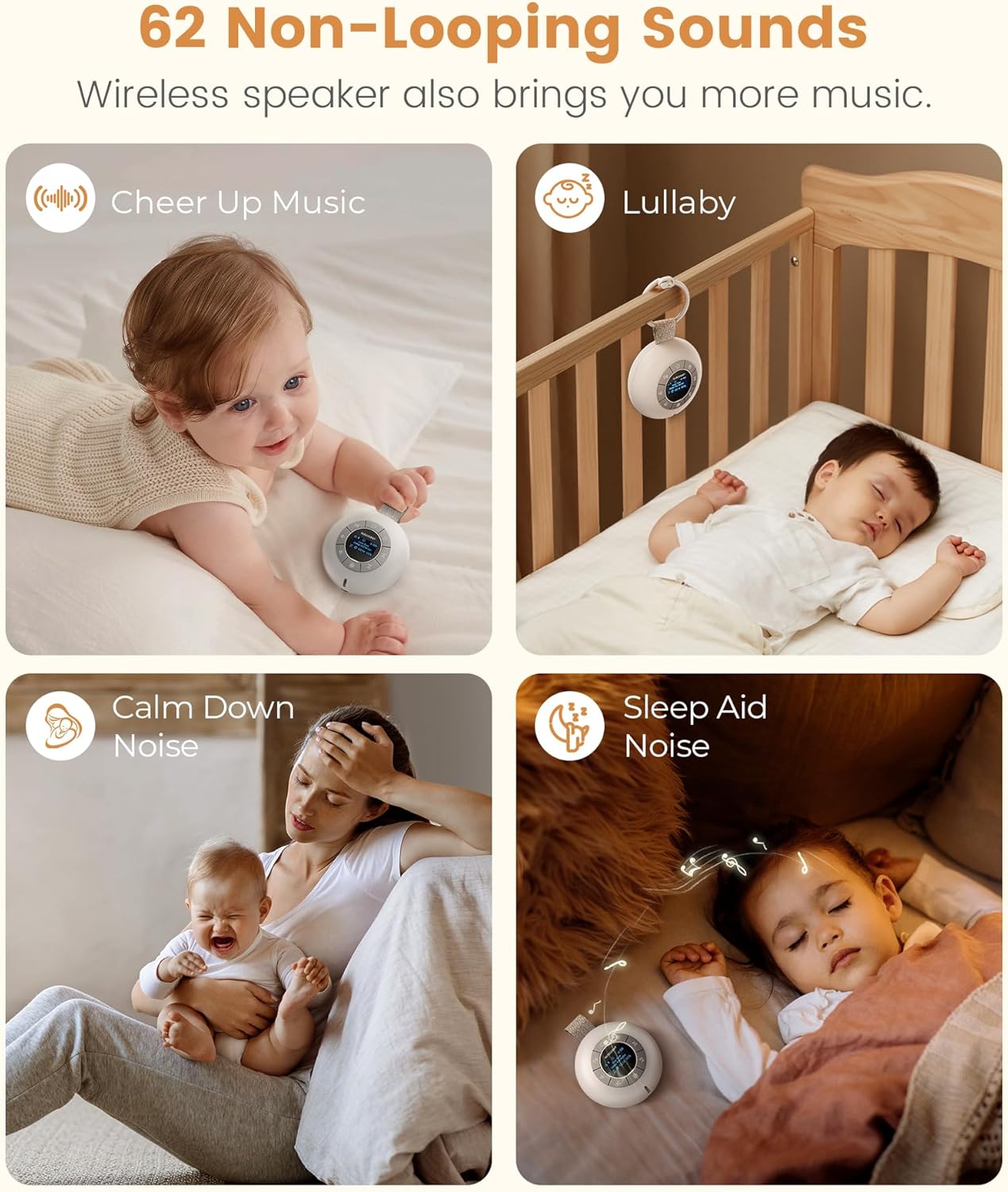 - [62 Non-Looping Sleep Sounds] Features 62 carefully curated sounds, including cheer up music, lullabies, and relaxing white noise (rain, ocean, cracking fire, thunder, birdsong, seagull, etc.). All sounds play seamlessly without repetition to prevent auditory fatigue. Easily find the perfect sound to soothe your baby faster, improve sleep quality, and serve as an essential parenting helper. Ideal as a baby sleep soother and adult sleep sound machine.