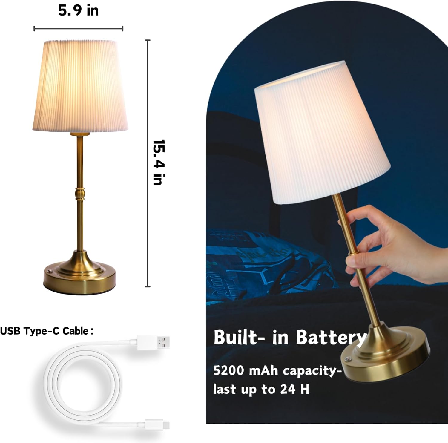 - Rechargeable Long-Lasting Battery: The Cordless Lamp has a built-in high-capacity lithium battery with 5V/2A fast charging (includes dedicated cable). Provides up to 20 hours on low brightness, freeing you from power outlets