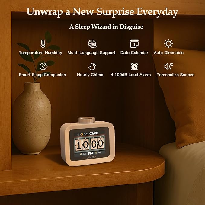 - 【Surprise Bonus All-in-one】 Temperature and Humidity Environment Hub – Built-in ±0.2°C precision thermometer/hygrometer monitors room comfort , Date display, 7-day programmable Loud Alarms, Hourly Chime, Dynamic Animated Theme for Wake-up and Sleep.