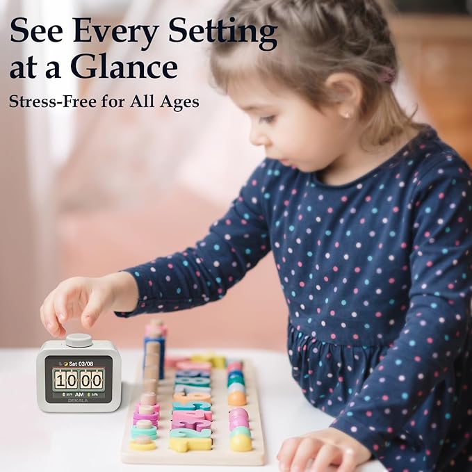 - 【Surprise Bonus All-in-one】 Temperature and Humidity Environment Hub – Built-in ±0.2°C precision thermometer/hygrometer monitors room comfort , Date display, 7-day programmable Loud Alarms, Hourly Chime, Dynamic Animated Theme for Wake-up and Sleep.