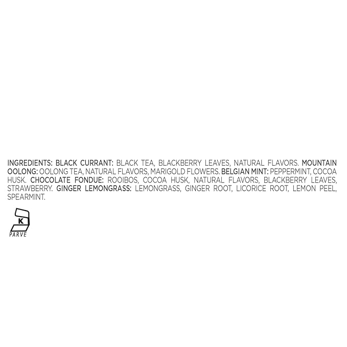 - TEA COLLECTION includes 10 pyramid infusers with 2 of each: Black Currant, Moutain Oolong, Belgian Mint, Chocolate Fondue, Ginger Lemongrass