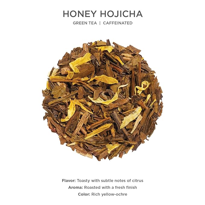 - HONEY HOJICHA - Roasted green tea adorned with toasty caramel and honey notes.