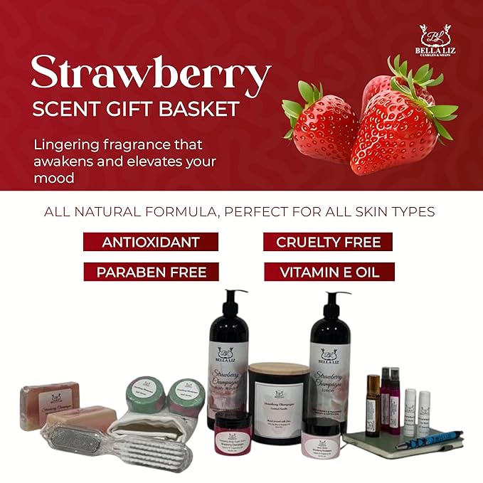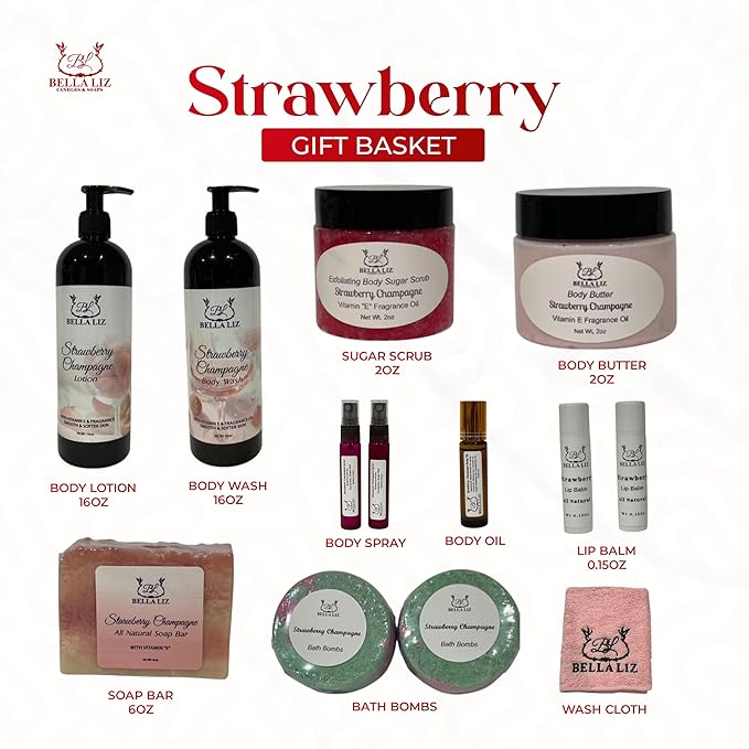 Bella Liz Strawberry Gift Set – 14 piece Spa Set with Soy Candle, Handmade Soaps, Body Wash & Lotion, Bath Bombs, Lip Balms, Sugar Scrub, Body Butter & More – Self-Care Gift