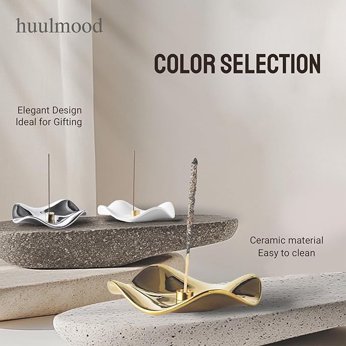 - Unique Design & Premium Material These Incense Holders Feature a Sleek, Wave - Shaped Ceramic Base Paired with a Solid Brass Stick Holder. The Combination of Smooth Ceramic (Available in Gold, Silver, or White Finishes) and Durable Brass Creates an Elegant, Modern Look that Elevates Any Home Decor. Perfect for Displaying Incense Sticks While Adding a Touch of Sophistication to Your Space