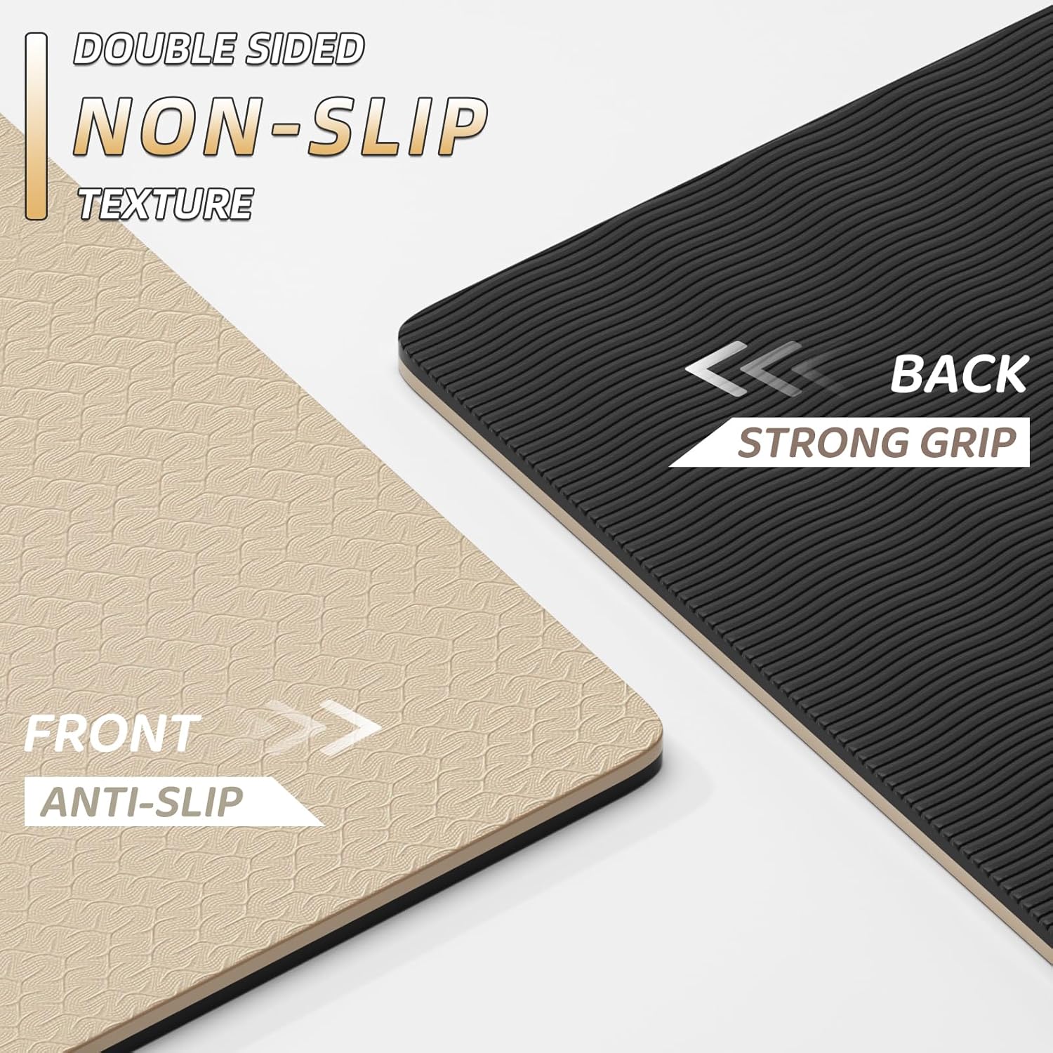 - Slip-Resistant Exercise Mat: This non-slip yoga mat has textured surfaces on both sides to increase friction with the ground and provide you with the best grip