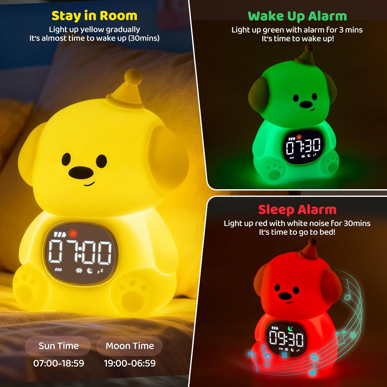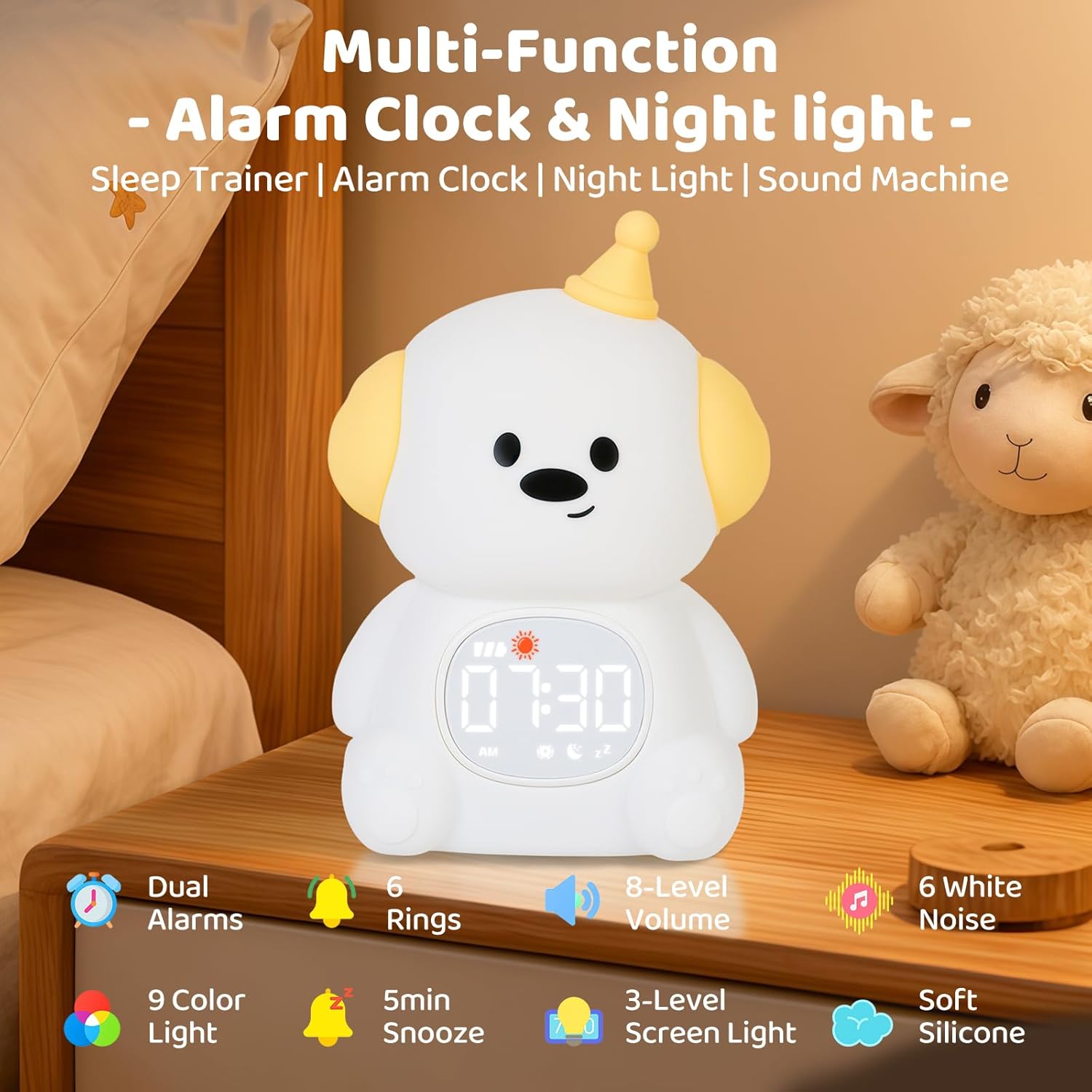 Dog Alarm Clock with Night Light for Kids with Sleep Training and Sound Machine, Rechargeable Silicone Lamp OK to Wake Clock,Cute Animal Tabletop Lamp, Perfect Sleep Companion for Boys Girls