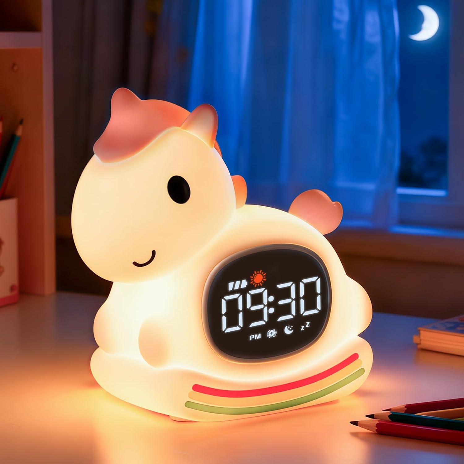 Alarm Clock with Night Light for Kids with Sleep Training and Sound Machine, Rechargeable Silicone Lamp OK to Wake Clock,Cute Animal Tabletop Lamp, Perfect Sleep Companion for Boys Girls,Pink Pony
