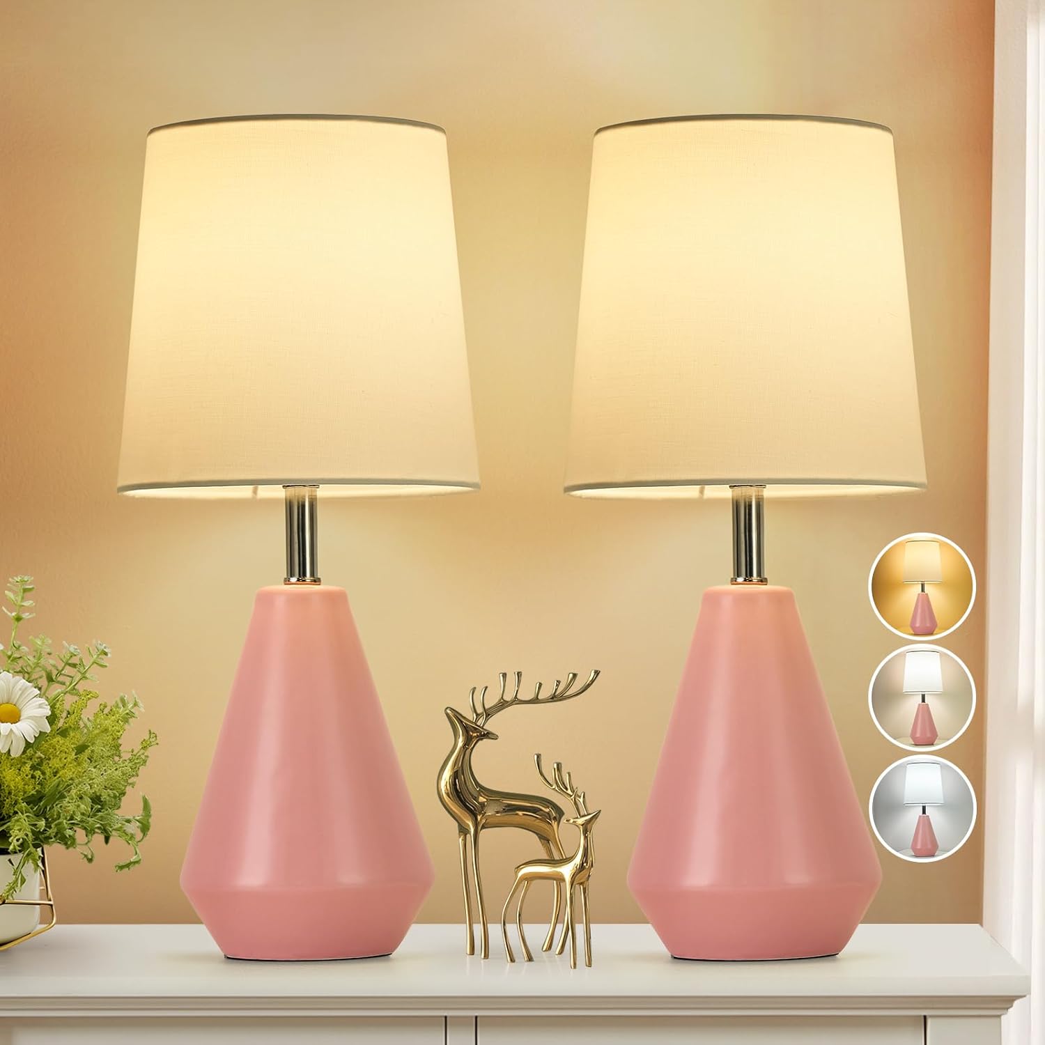 Small Bedside Table Lamp for Bedroom-Reading Desk Lamp Set of 2,with 3 Color Temperatures,15.5" Nightstand Ceramic Lamp with Fabric Shade for Kids Room,Living Room,Dorm,Home Office(Pink+White)